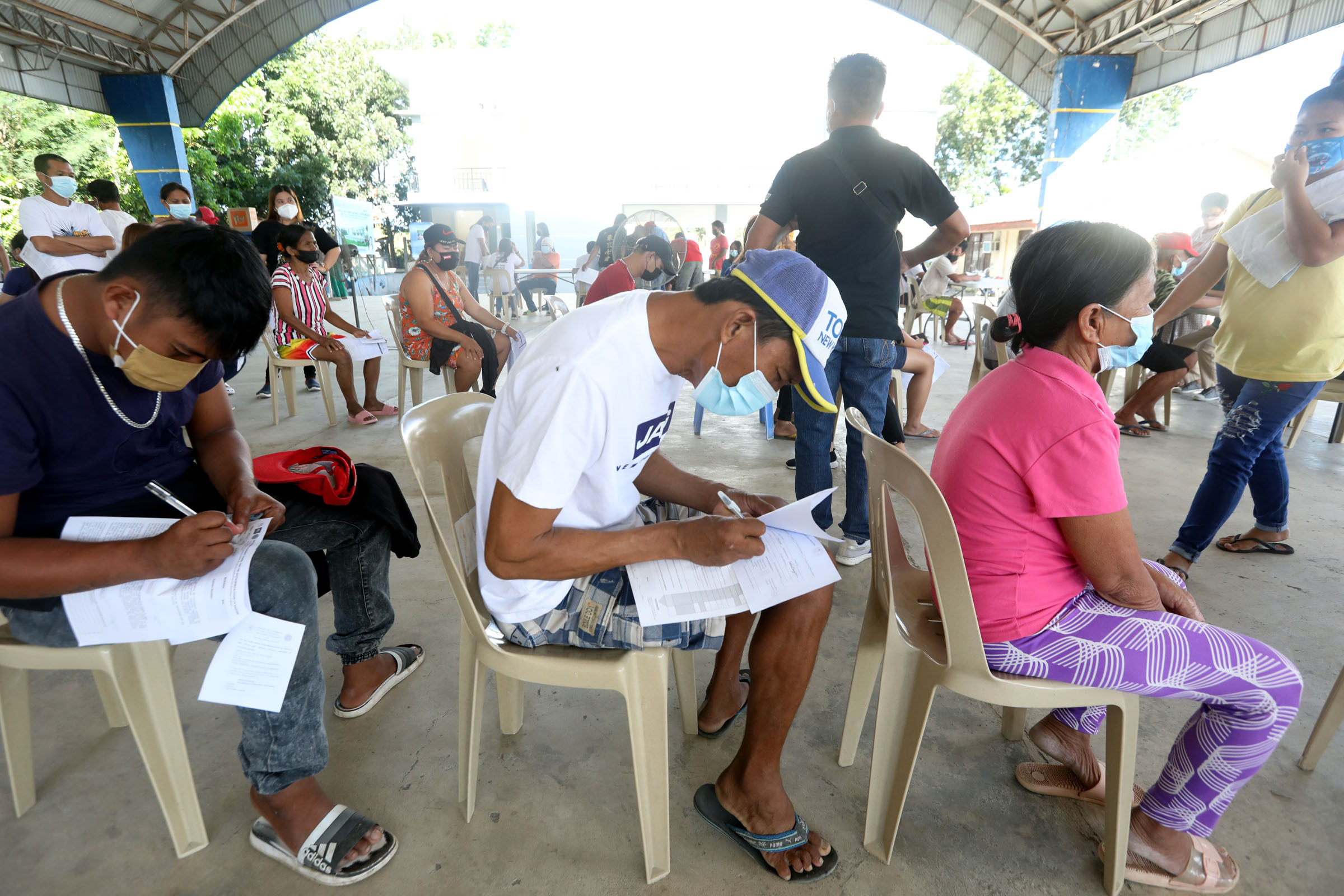 Residents of Peñaranda, Nueva Ecija fill out the personal data form before getting their coronavirus shots at the Peñaranda City Hall covered court on Monday (Jan. 24, 2022). Local officials have campaigned for the vaccination against the coronavirus, prompting residents to get their first dose and booster shots. (PNA photo by Oliver Marquez)