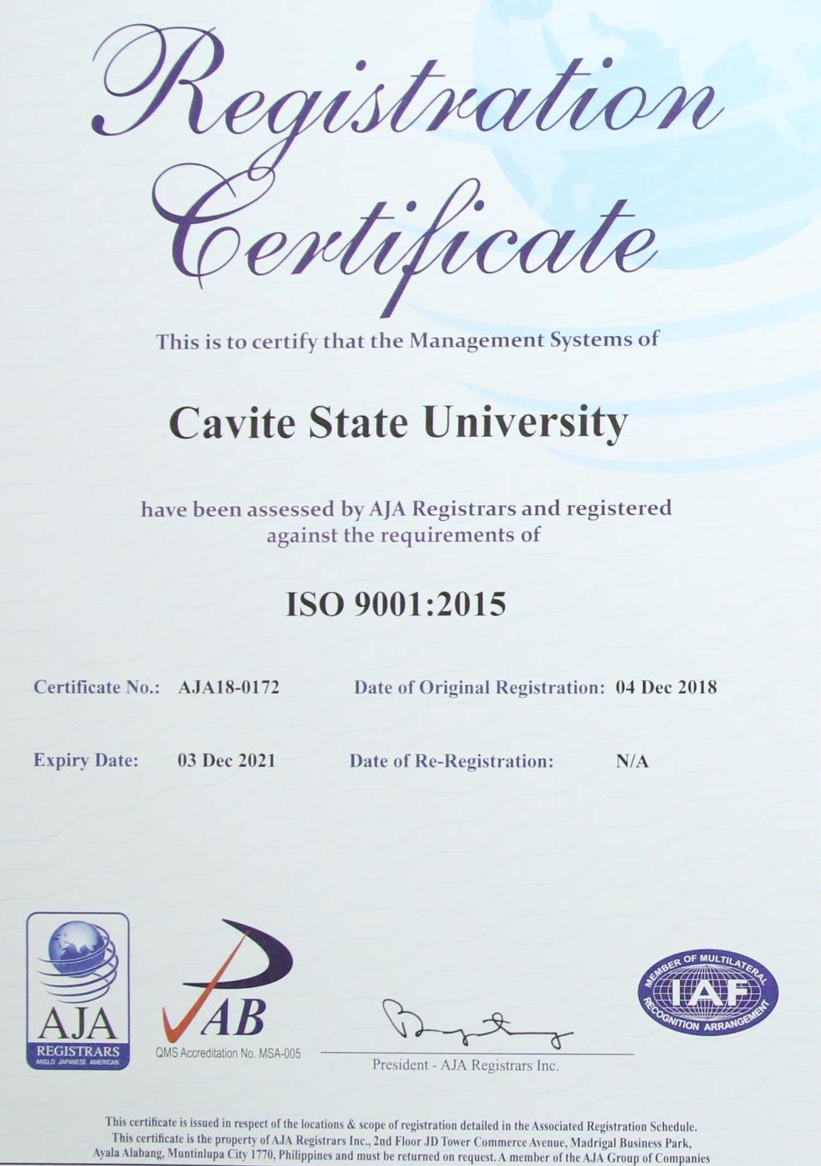 INDANG, Cavite — The management system of the Cavite State University (CvSU) main campus here has obtained the ISO 9001:2005 certification, after being assessed and certified by AJA Registrars, a third-party standards certification body.