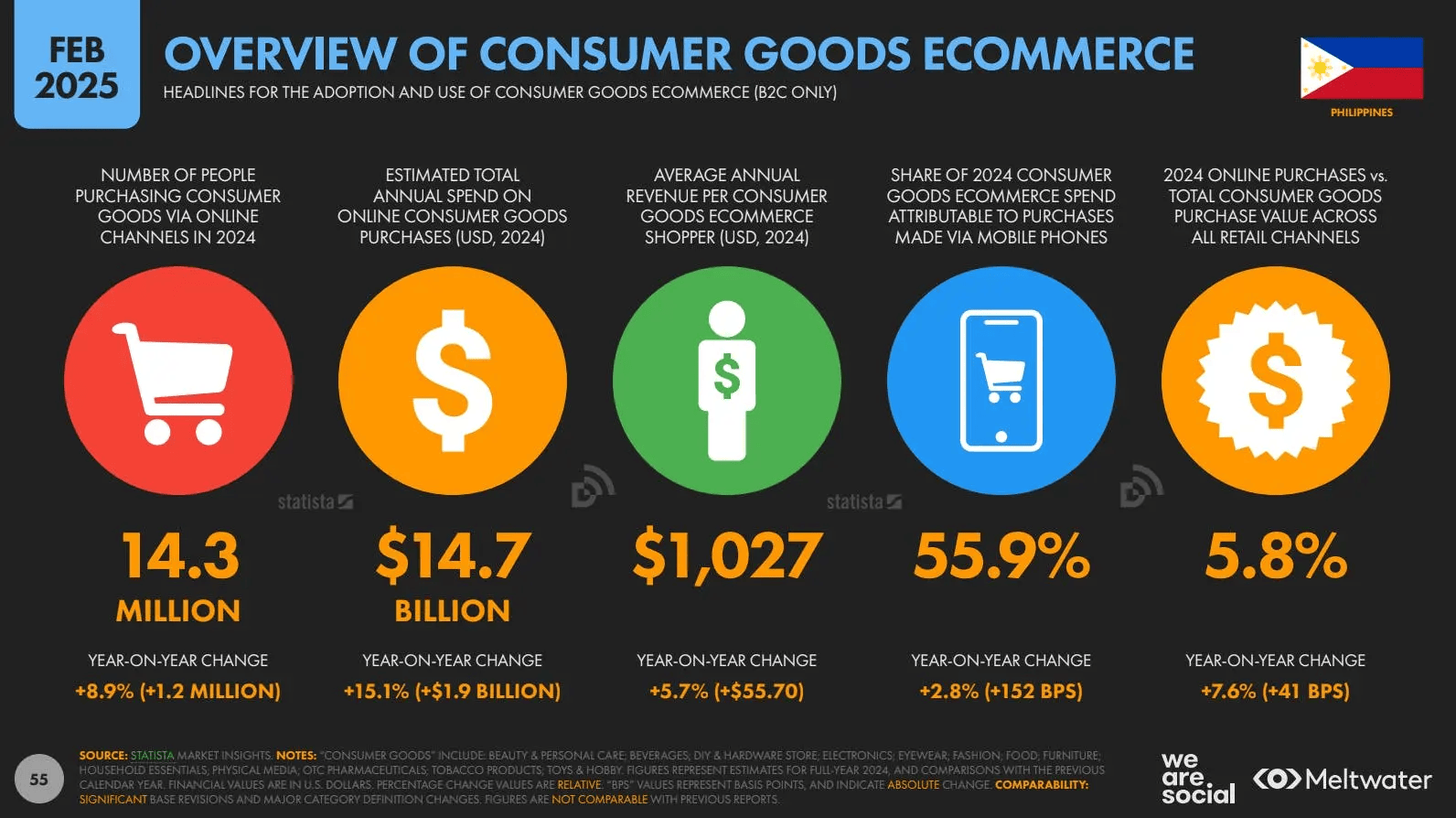 Meltwater likewise noted that in 2024, 14.3 million Filipinos spent a total of $14.7 billion in purchases of consumer goods online, with 55.9% of such transactions being made on mobile phones.