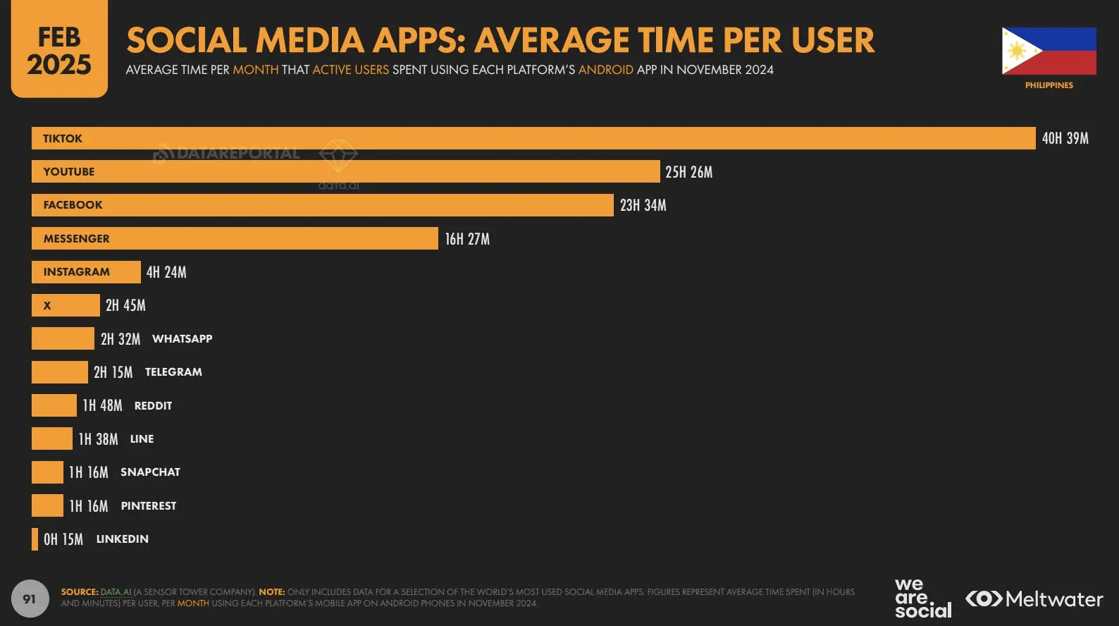 This is followed by YouTube with 25 hours and 26 minutes, Facebook at 23.5 hours, and Messenger at 16 hours and 27 minutes, mirroring Filipinos’ appetite for primarily consuming video content online.