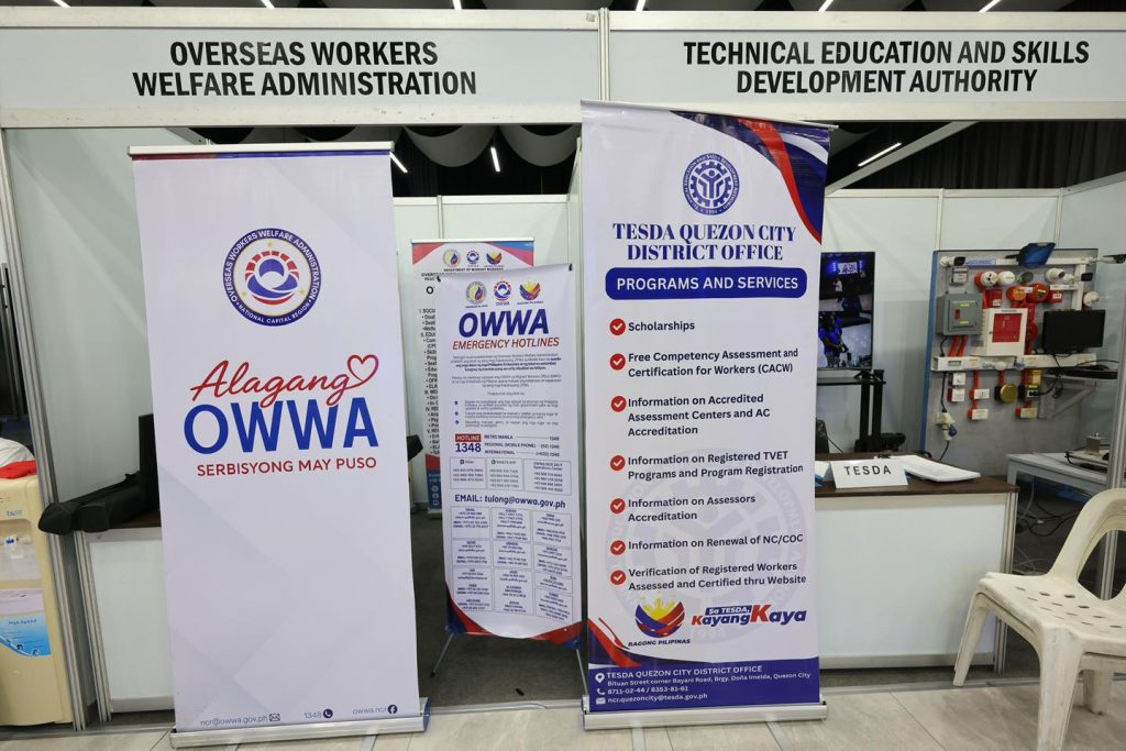 The booths of Overseas Workers Welfare Administration (OWWA) and Technical Education and Skills Development Authority (TESDA) at the Bayanihan Para sa Balikbayang Manggagawa National Reintegration Network and Job Fair launched in Quezon City on Monday, April 6, 2026. (Photo courtesy: QC LGU)