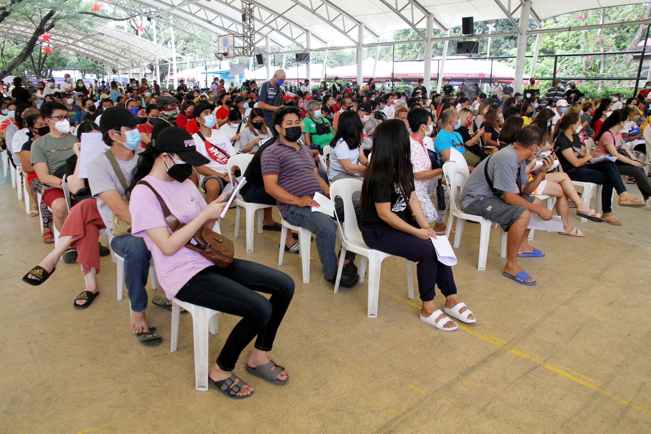 Quezon City residents and workers wait for their turn for booster shots at the Quezon Memorial Circle on Saturday (Jan. 15, 2022). The Department of Health allows the administration of booster jabs three months after the second primary dose and two months after the single-shot Janssen vaccine. (PNA photo by Rico H. Borja)