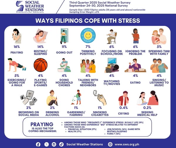 With the Philippines being a predominantly Catholic nation, it is not surprising that the majority of Filipinos lean on their religious beliefs to alleviate stress, according to the results of a survey conducted by the Social Weather Stations (SWS) from September 24-30.