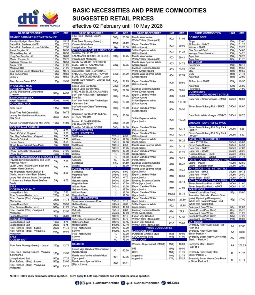 According to the DTI’s latest SRPs for basic goods, the products included in the extension period are canned sardines, processed milk, bread, coffee, locally-manufactured instant noodles, bottled water, laundry soap and detergents, candles, salt, canned meat, condiments, toilet soap, and batteries.