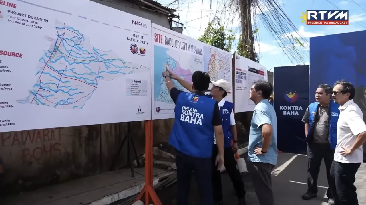 ADDRESSING FLOODING. President Ferdinand R. Marcos Jr. inspects the Oplan Kontra Baha implementation at Mambuloc Creek in Bacolod City on Friday (Dec. 12, 2025). Marcos said that flooding may be reduced by up to 60% through the cleaning and clearing of waterways and drainage systems. (Screengrab: RTVM)