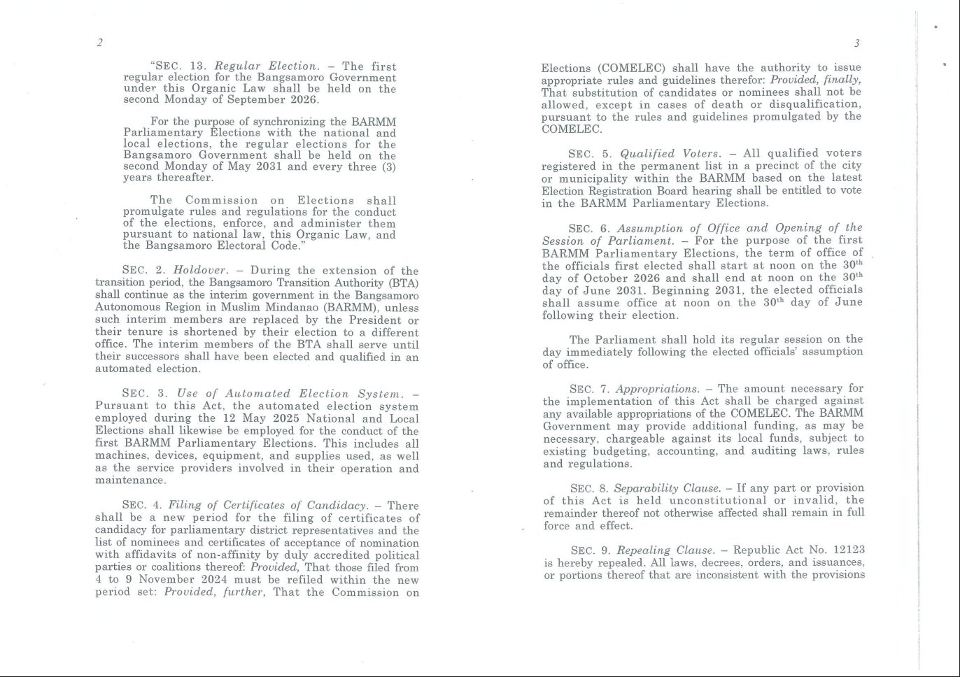 “The signing of this law strengthens the foundations of the Bangsamoro political system and ensures that the first regular parliamentary elections are conducted in a credible, orderly, and well-prepared manner,” Speaker Dy said.