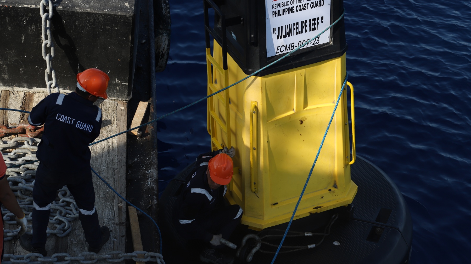 The Philippine Coast Guard (PCG) installs additional buoys in the Kalayaan Island Group, May 2023. (Photo courtesy of PCG)