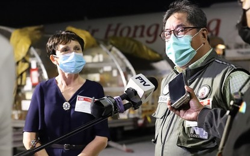 National Task Force Against COVID-19 Special Adviser Dr. Teodoro Herbosa (right) speaks to the media during the arrival of 811,980 doses of Pfizer vaccine donated by the French government at Ninoy Aquino International Airport Terminal 3 in Pasay City on Saturday night (Dec.18, 2021). France Ambassador to the Philippines Michèle Boccoz (left) said France hopes to donate 6 million doses of vaccine to the Philippines through COVAX Facility. (PNA photo by Robert Oswald P. Alfiler)