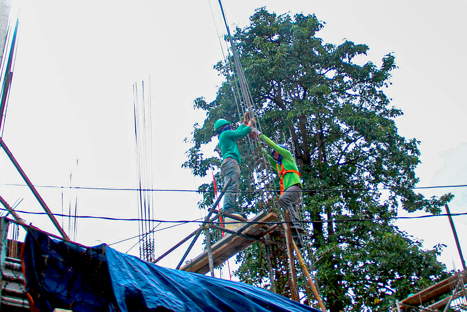 BALANCING ACT. Workers erect a steel pillar at a residential house construction in Kamuning, Quezon City on Monday (March 10, 2025). (PNA photo by Robert Oswald P. Alfiler)