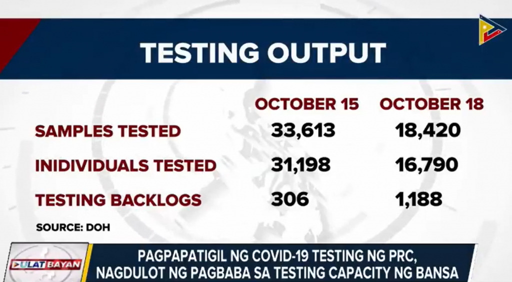 Samples tested on October 18 have declined to 18,420 from the 33,613 samples in October 15. The number of individuals tested in the same period fell to 16,790 from 31,198, while testing backlogs have increased to 1,188 from 306.