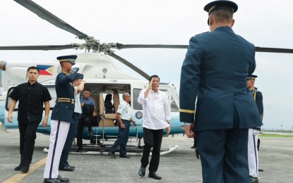 TOKYO VISIT: President Rodrigo Roa Duterte salutes a military officer as he prepares to board a plane bound for Japan at the Villamor Air Base in Pasay City on May 28, 2019. The President is set to participate in the 25th Nikkei Conference on the Future of Asia in Tokyo. (Rey Baniquet/Presidential Photo)