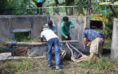 PROBLEM SALTWATER CROCODILE CAPTURED IN PALAWAN: Male saltwater crocodile “Singko” can be seen in this photo while being transferred to a 20×25-square-meter holding pen inside the crocodile breeders’ area of the Palawan Wildlife Rescue and Conservation Center (PWRCC) in Barangay Irawan, Puerto Princesa City. He was captured on December 1, 2018, in Carandungan Bay, Barangay Poblacion V, Balabac at the southernmost tip of Palawan. (Photo courtesy of the PWRCC/PCSDS)