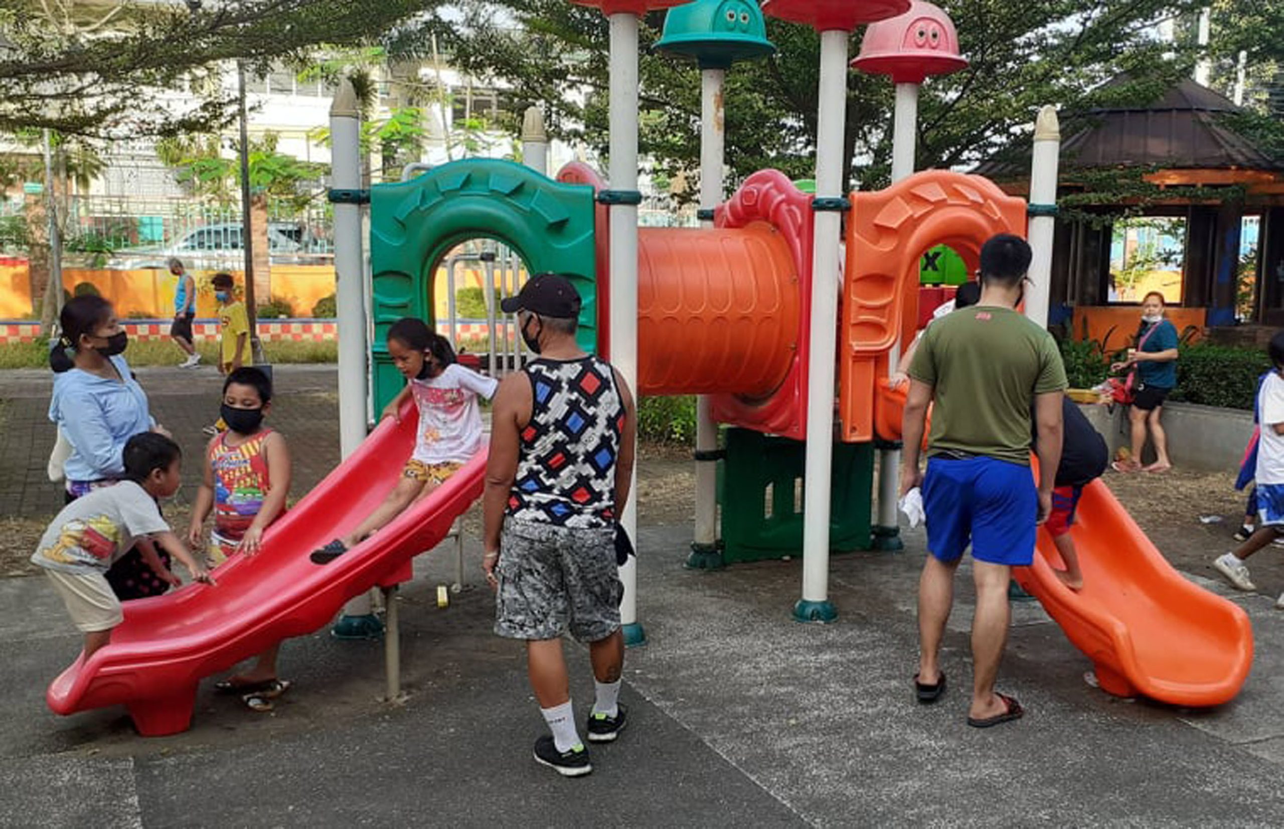 Home Guardians watch over their children playing at a public park in Barangay 187, Tala, Caloocan City on Friday (Nov. 19, 2021). As the National Capital Region is under Alert Level 2, children are allowed out so long as they practice safety protocols against Covid-19 and are supervised by adults. (PNA photo by Ben Briones) Guardians watch over their children playing at a public park in Barangay 187, Tala, Caloocan City on Friday (Nov. 19, 2021). As the National Capital Region is under Alert Level 2, children are allowed out so long as they practice safety protocols against Covid-19 and are supervised by adults. (PNA photo by Ben Briones)