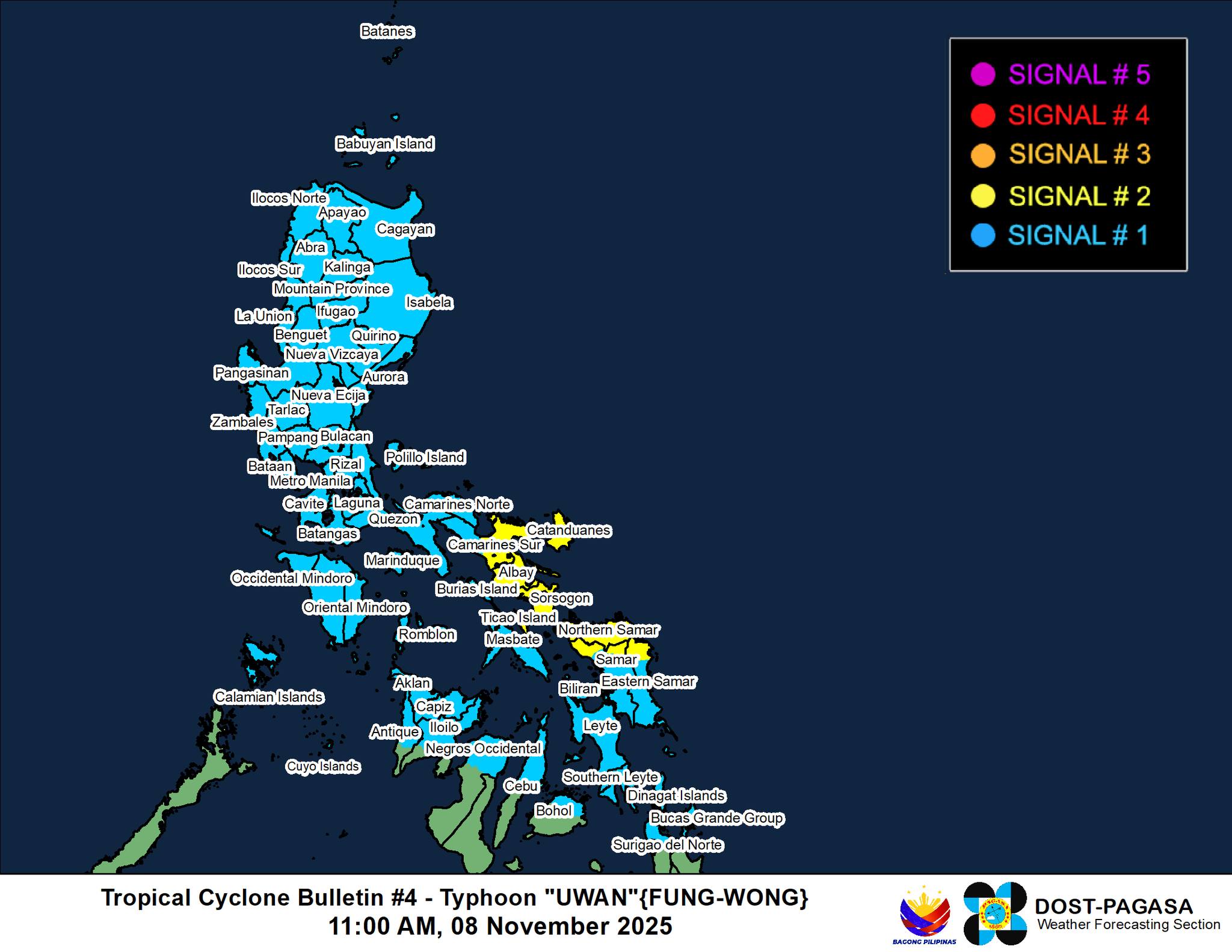 Uwan is expected to further intensify over the next 24 hours, possibly reaching supertyphoon category on Saturday night or Sunday morning as it makes a close approach in Northern Samar and Bicol region prior to making landfall over the Aurora-Isabela area on Sunday, eventually traversing North and Central Luzon. (with report from Harley Valbuena | PTV News)